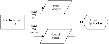 .sis file directly from a PC, using EPOC Connect.sis file. Note: see The add/remove program for a discussion on compatibility issues related to the Add/remove program.The following diagram illustrates the two recommended methods for installing applications using the EPOC installation procedure: